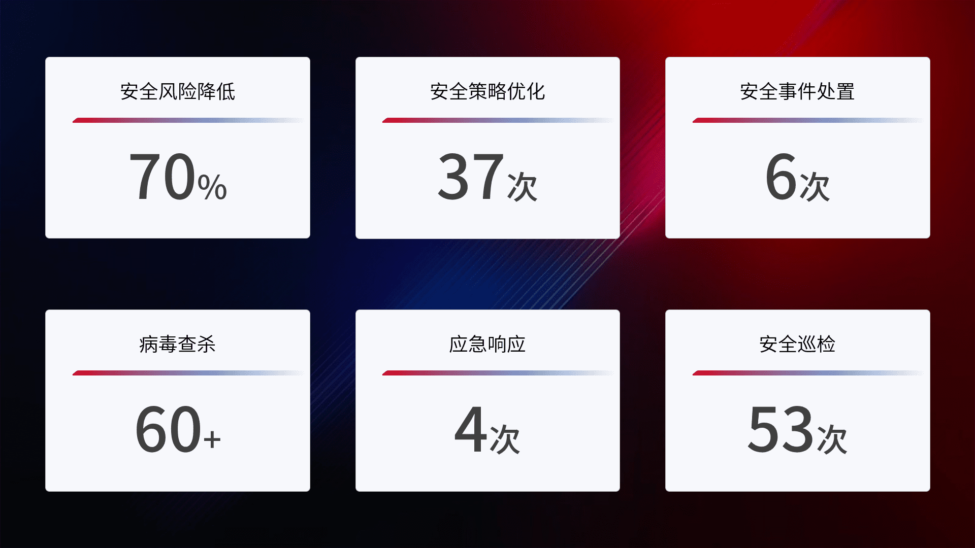 提供全面的安全事件报告体系,,,包括处置报告、、周报、、季度和年度总结,,,,结合持续监控,,帮助客户深入了解网络安全状况。。